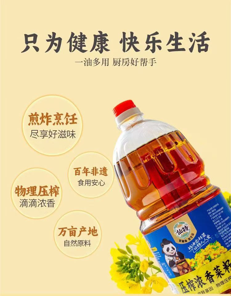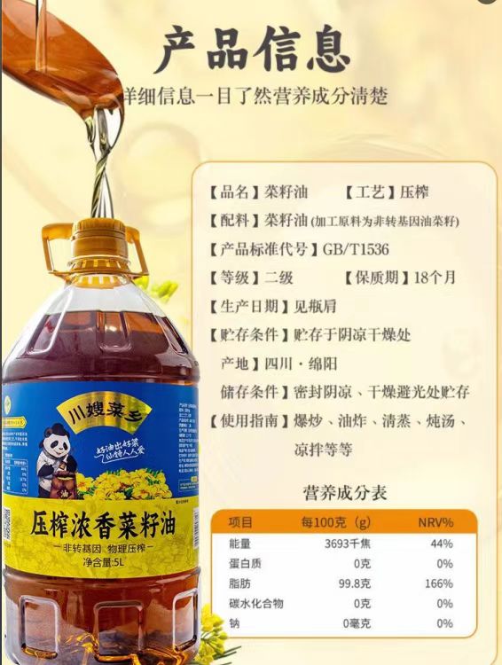 壓榨濃香菜籽油,源自四川綿陽精選優(yōu)質(zhì)非轉(zhuǎn)基因油菜籽,秉承傳統(tǒng)小榨工藝,充分保留了菜籽的營養(yǎng)成分與濃郁香氣。其獨特的濃香風(fēng)味,適合煎、炒、炸等多種烹飪方式。 保質(zhì)期:18個月 執(zhí)行標(biāo)準(zhǔn):GB/T 1536 儲存方式:存放于陰涼、干燥處 規(guī)格:900ml、1L、1.8L、2.5L、5L、12.5L、27L等多種規(guī)格